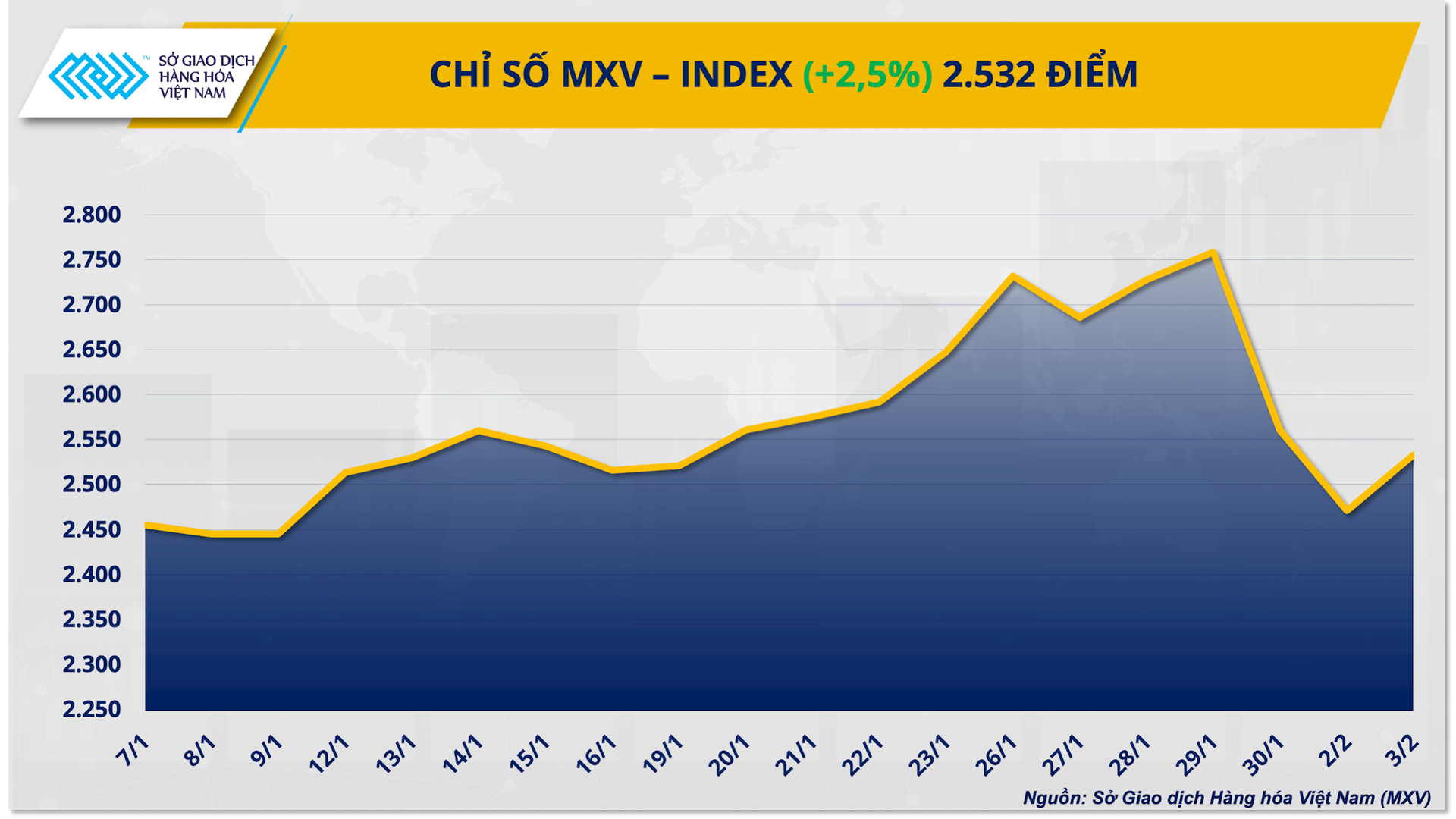 Sự bứt phá mạnh mẽ của nhóm kim loại, dẫn đầu là cú lội ngược dòng hơn 8% của giá bạc, đã kéo chỉ số MXV-Index tăng 2,5% lên 2.532 điểm trong phiên giao dịch ngày 3/2.