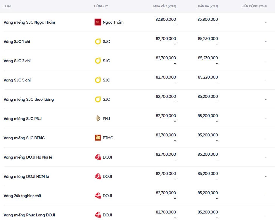Giá vàng SJC của Công ty Vàng bạc Đá quý Sài Gòn giữ nguyên so với ngày hôm qua, niêm yết ở mức 82,7 - 85,2 triệu đồng/lượng (mua vào - bán ra). Tương tự, giá vàng Rồng Thăng Long của Bảo Tín Minh Châu cũng không biến động, duy trì ở mức 82,98 – 84,08 triệu đồng/lượng (mua vào - bán ra).