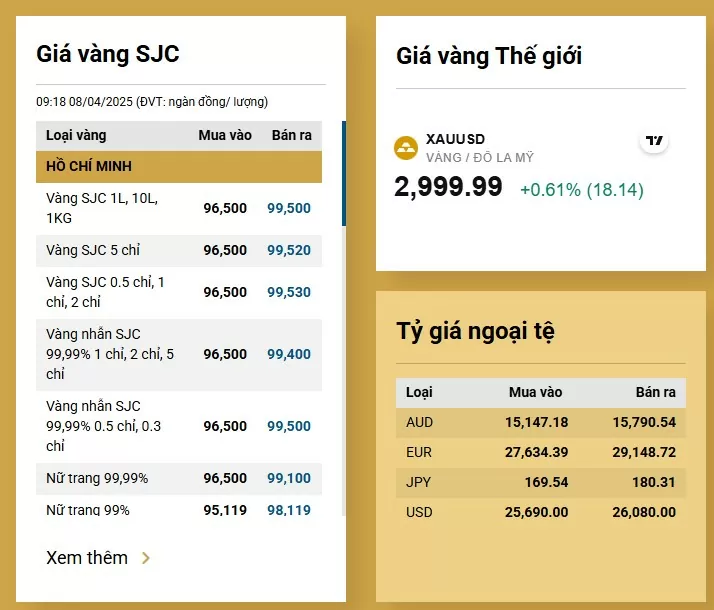 Giá vàng hôm nay 8/4, giá vàng trong nước giảm rất sâu. Thời điểm 9h30, Công ty TNHH MTV Vàng Bạc Đá quý Sài Gòn - SJC niêm yết giá vàng miếng SJC ở mức 96,5 - 99,5 triệu đồng/lượng mua vào, bán ra.