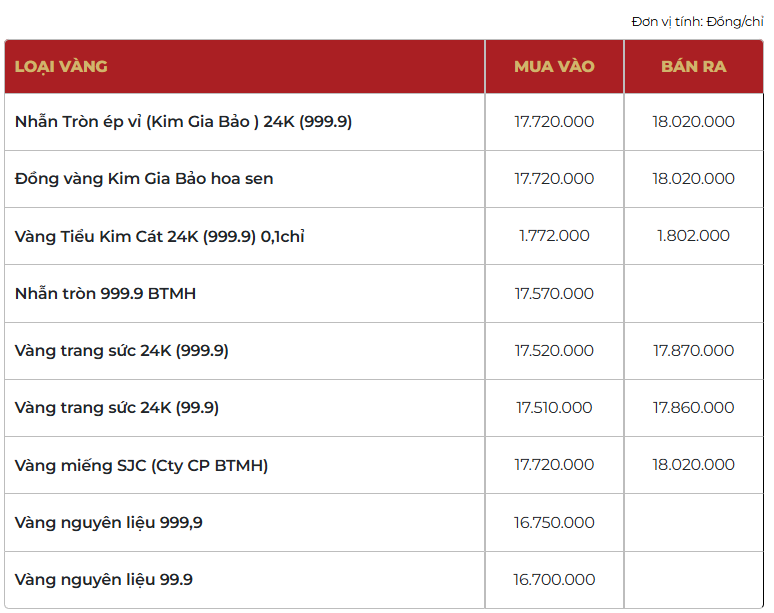 Bảo Tín Mạnh Hải niêm yết giá nhẫn tròn ép vỉ Kim Gia Bảo ở mức 177,2-180,2 triệu đồng/lượng (mua vào-bán ra), tăng 3,7 triệu đồng/lượng cả hai chiều mua vào và bán ra so với chốt phiên giao dịch trước.
