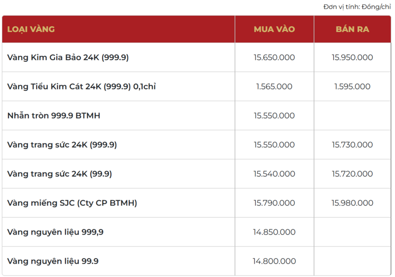 Giá vàng Kim Gia Bảo tại Bảo Tín Mạnh Hải niêm yết ở mức 156,5-159,5 triệu đồng/lượng tăng 3,5 đồng/lượng ở cả hai chiều mua vào - bán ra so với chốt phiên giao dịch tuần trước. Biên độ mua bán vàng ở mức 3 triệu đồng/lượng.