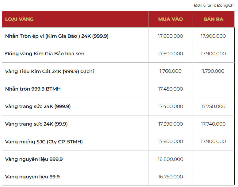 Bảo Tín Mạnh Hải niêm yết giá nhẫn tròn ép vỉ Kim Gia Bảo ở mức 176-179 triệu đồng/lượng (mua vào-bán ra), giảm 2 triệu đồng/lượng cả hai chiều mua vào và bán ra so với chốt phiên giao dịch trước.