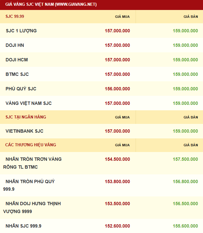 Giá vàng miếng được Công ty TNHH MTV Vàng bạc đá quý Sài Gòn - SJC, Bảo Tín Minh Châu, PNJ, Tập đoàn DOJI cùng niêm yết giá vàng ở mức 157-159 triệu đồng/lượng (mua vào - bán ra), mức giá tăng 1,5 triệu đồng/lượng ở cả hai chiều mua - bán so với hôm qua.