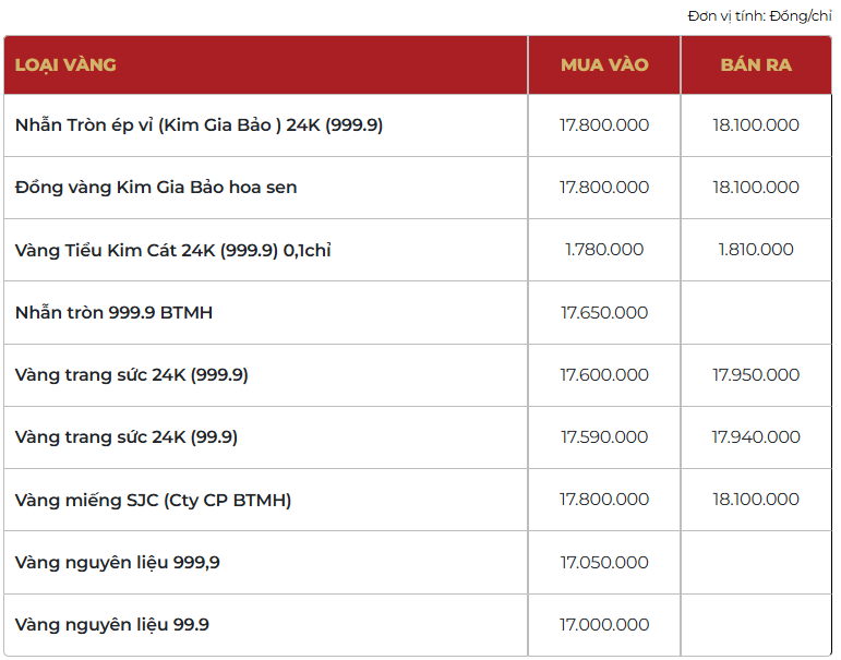 Bảo Tín Mạnh Hải niêm yết giá nhẫn tròn ép vỉ Kim Gia Bảo ở mức 178-181 triệu đồng/lượng (mua vào-bán ra), giữ nguyên cả hai chiều mua vào và bán ra so với chốt phiên giao dịch trước.