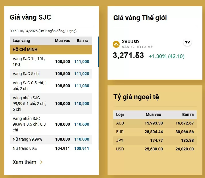 Giá vàng hôm nay 16/4 tăng cao chưa từng có. Thời điểm 10h, Công ty TNHH MTV Vàng Bạc Đá quý Sài Gòn – SJC niêm yết giá vàng SJC ở mức 108,5 triệu đồng/lượng mua vào và 111 triệu đồng/lượng bán ra.