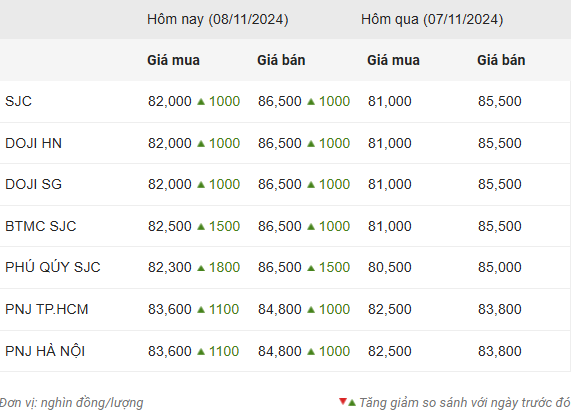 Cụ thể, Công ty Vàng bạc đá quý Sài Gòn (SJC) niêm yết giá mua - bán vàng miếng SJC tại 82 – 86,5 triệu đồng/lượng, tăng 1 triệu đồng/lượng chiều mua và chiều bán so với chôt phiên hôm qua.