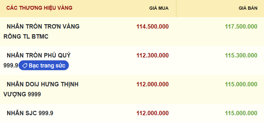 Tương tự với giá vàng miếng, giá vàng nhẫn được các thương hiệu SJC, DOJI, Phú Quý và Bảo Tín Minh Châu điều chỉnh tăng 700.000 - 1 triệu đồng/lượng ở cả 2 chiều mua - bán so với phiên trước. Hiện giá vàng nhẫn thấp hơn vàng miếng khoảng 3,5 - 6 triệu đồng/lượng.