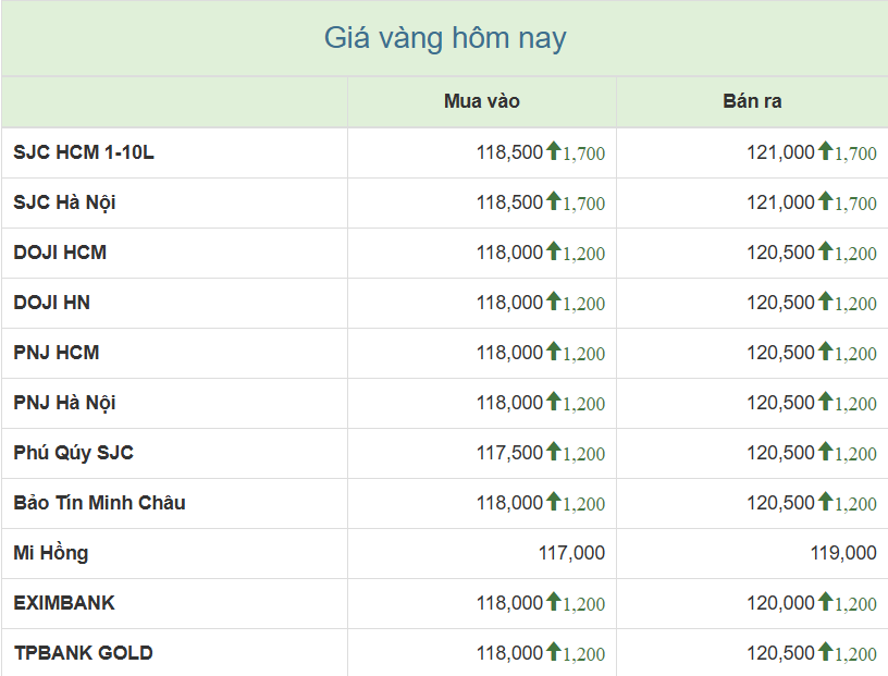 Cùng diễn biến, Tập đoàn Vàng bạc Đá quý DOJI, PNJ và Bảo Tín Minh Châu cùng niêm yết giá vàng miếng SJC ở mức 118 - 120,5 triệu đồng/lượng, tăng 1,2 triệu đồng/lượng cả hai chiều mua - bán so với phiên trước.