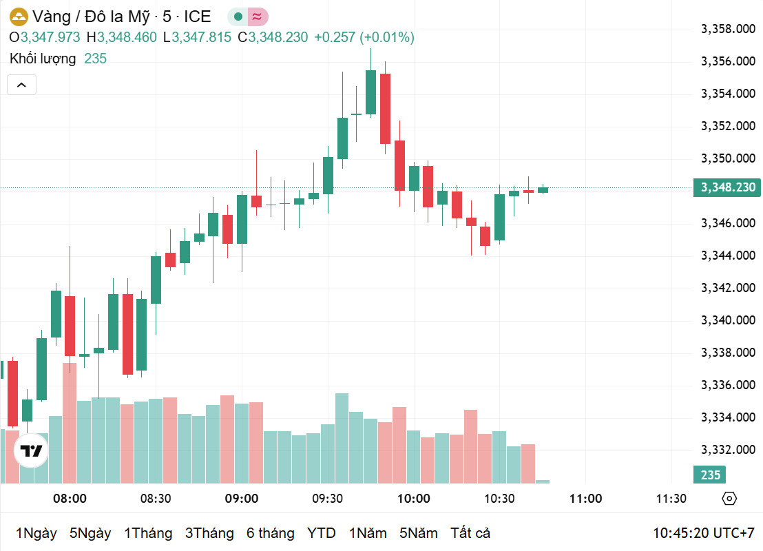 Giá vàng hôm nay ở thị trường trong nước đi xuống theo đà giảm của giá thế giới. Thời điểm 10h30 hôm nay (ngày 26/5, giờ Việt Nam), theo Kitco.com, giá vàng thế giới giao dịch ở mức 3.348 USD/ounce, giảm 14,51 USD/ounce so với phiên trước. Quy đổi theo tỷ giá Vietcombank, giá vàng thế giới đang ở khoảng 105,35 triệu đồng/lượng.