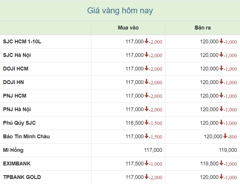 Công ty Vàng bạc đá quý Sài Gòn (SJC), Tập đoàn Vàng bạc Đá quý DOJI, PNJ cùng niêm yết giá mua - bán vàng miếng SJC ở mức 117 – 120 triệu đồng/lượng, giảm 2 triệu đồng/lượng chiều mua và 1 triệu đồng/lượng bán so với phiên trước.