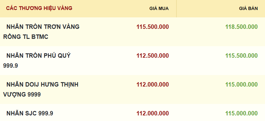 Tương tự với giá vàng miếng, giá vàng nhẫn được các thương hiệu SJC, DOJI, Phú Quý và Bảo Tín Minh Châu điều chỉnh giảm 300.000 - 500.000 đồng/lượng ở cả 2 chiều mua - bán so với phiên trước. Hiện giá vàng nhẫn thấp hơn vàng miếng khoảng 2,5 - 4,5 triệu đồng/lượng.