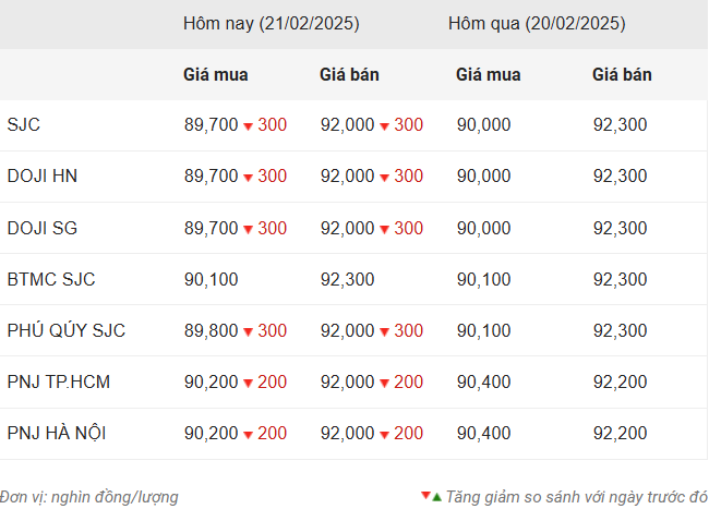 Trên thị trường quốc tế, cập nhật thời điểm 10h19 ngày 21/2 (giờ Việt Nam), giá vàng thế giới ở mức 2.932 USD/ounce, tăng 13 USD so với phiên trước. Quy đổi theo tỷ giá Vietcombank, giá vàng hiện đạt 90,72 triệu đồng/lượng (đã bao gồm thuế, phí). Như vậy, nếu so với giá vàng miếng SJC bán ra là 92 triệu đồng/lượng, thì chênh lệch giữa giá vàng trong nước và giá vàng thế giới khoảng 1,28 triệu đồng/lượng.