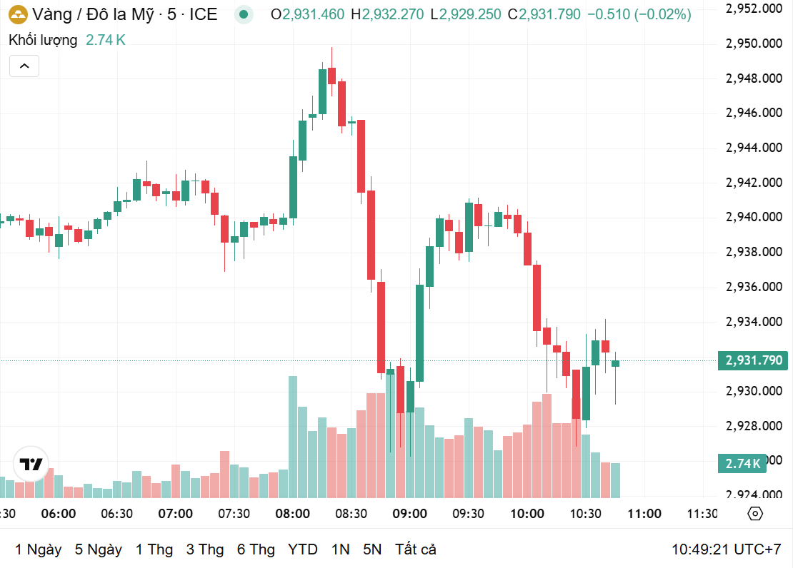 Giá vàng thế giới dao động ở gần mức cao kỷ lục 2.950 USD của phiên trước và giữ đà tăng tuần thứ 8 liên tiếp, được thúc đẩy bởi sự hấp dẫn về an toàn trong bối cảnh bất ổn toàn cầu gia tăng.