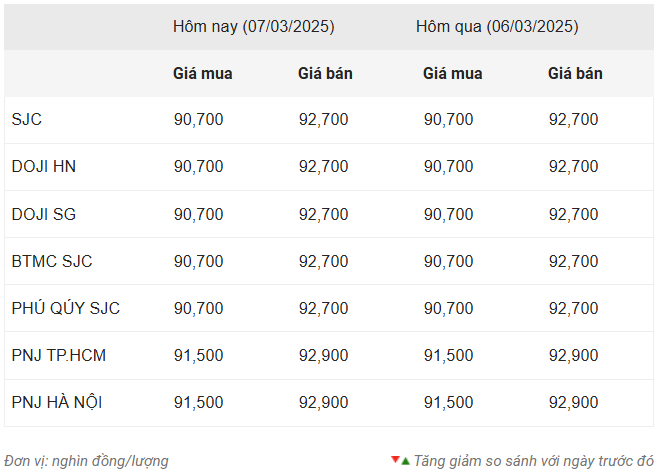 Trên thị trường quốc tế, cập nhật thời điểm 10h46 ngày 7/3 (giờ Việt Nam), giá vàng thế giới hiện ở mức 2.905 USD/ounce, giảm 13,27 USD so với phiên trước. Quy đổi theo tỷ giá Vietcombank, giá vàng hiện đạt 91,48 triệu đồng/lượng (đã bao gồm thuế, phí). Như vậy, với mức giá 92,7 triệu đồng/lượng, vàng miếng đang cao hơn giá vàng thế giới 1,22 triệu đồng.
