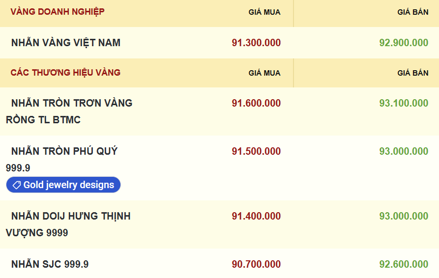 Diễn biến tương tự, giá vàng nhẫn SJC cũng đi ngang so với chốt phiên hôm qua, hiện ở mức 90,7 - 92,6 triệu đồng/lượng. Tại một số thương hiệu, giá mua vàng nhẫn vẫn giữ trên mức 91 triệu đồng/lượng và giá mua quang mức 93 triệu đồng/lượng, cao hơn giá vàng miếng 300.000 đồng/lượng.