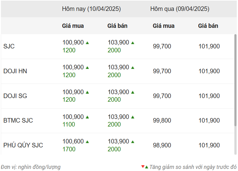 Cùng thời điểm, giá vàng miếng SJC sáng nay (ngày 10/4) được các thương hiệu điều chỉnh tăng 1,1 - 2 triệu đồng/lượng, giá bán ra hiện ở mức 103,9 triệu đồng/lượng, giá mua vào ở mức 100,9 triệu đồng/lượng.