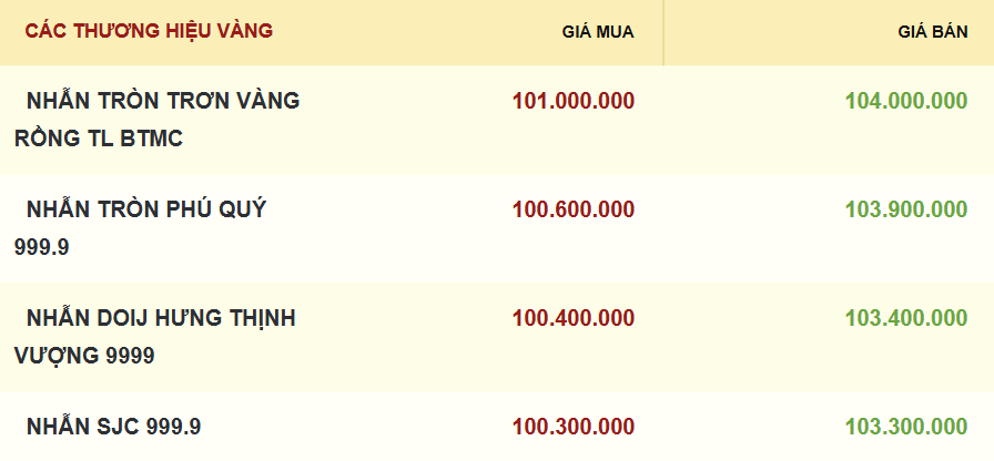 Giá vàng nhẫn tròn Phú Quý 999,9 được niêm yết ở mức 100,6 - 103,9 triệu đồng/lượng (mua-bán), tăng 1,4 triệu đồng/lượng chiều mua và 2 triệu đồng/lượng chiều bán so với phiên trước.