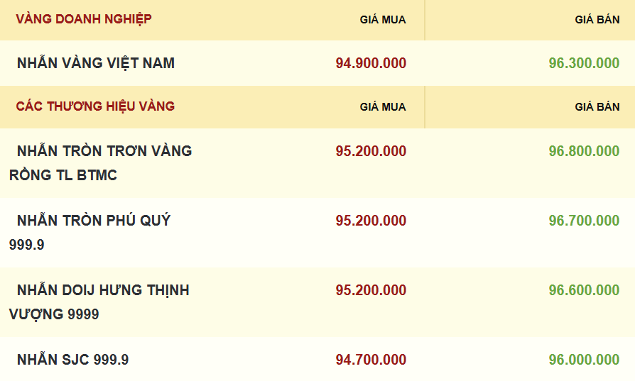 Cụ thể, Công ty Vàng bạc đá quý Sài Gòn (SJC) niêm yết giá vàng nhẫn SJC 999,9 mua vào - bán ra ở mức 94,7 - 96 triệu đồng/lượng, tăng 500.000 đồng/lượng chiều mua và 300.000 đồng/lượng chiều bán so với phiên trước.