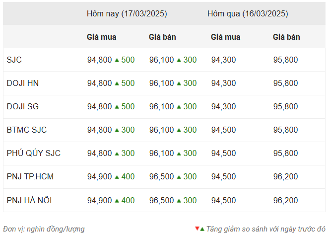 Công ty SJC, DOJI, Bảo Tín Minh Châu và Phú Quý SJC đều niêm yết giá vàng SJC mua vào - bán ra ở mức 94,8 - 96,1 triệu đồng/lượng. tăng 500.000 đồng/lượng chiều mua và 300.000 đồng/lượng chiều bán so với phiên trước. PNJ niêm yết giá vàng ở mức 94,9 - 96,5 triệu đồng/lượng (mua vào - bán ra), tăng 400.000 đồng/lượng chiều mua và 300.000 đồng/lượng chiều bán so với phiên trước.