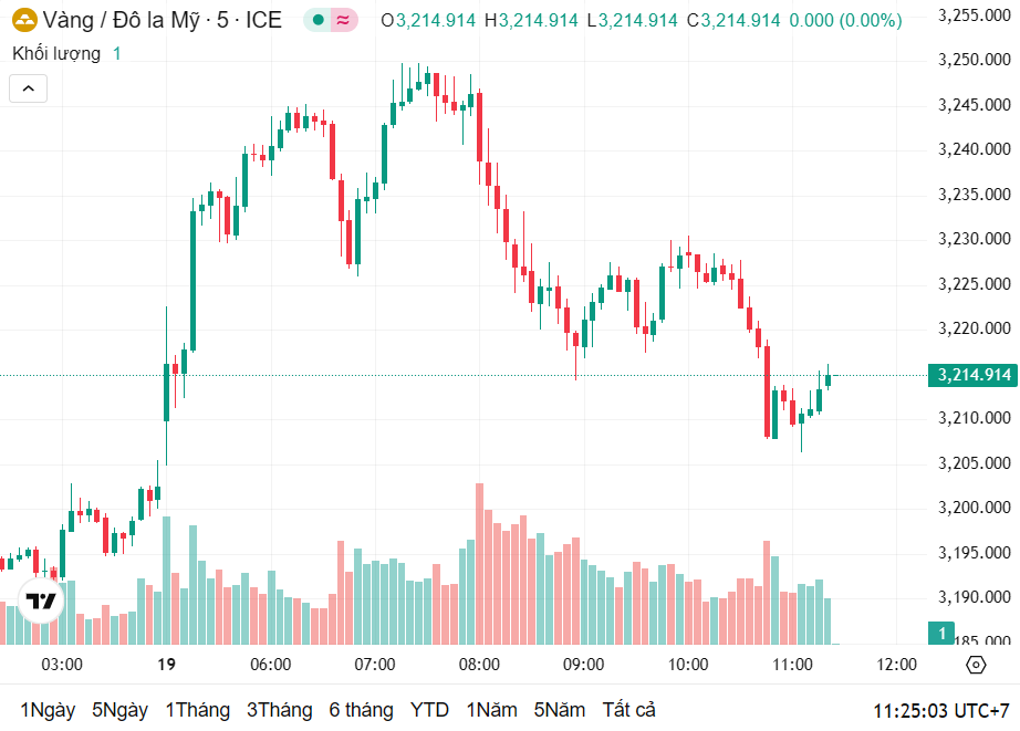 Giá vàng trong nước hôm nay tăng theo xu hướng phục hồi của thị trường quốc tế. Thời điểm 10h30 hôm nay (ngày 19/5, giờ Việt Nam), theo Kitco.com, giá vàng thế giới giao dịch ở mức 3.215 USD/ounce, tăng 11 USD/ounce so với phiên trước. Quy đổi theo tỷ giá Vietcombank, giá vàng thế giới đang ở khoảng 101,4 triệu đồng/lượng – thấp hơn nhiều so với giá bán ra của vàng SJC (119,3 triệu đồng/lượng) và vàng nhẫn (117,5 triệu đồng/lượng).