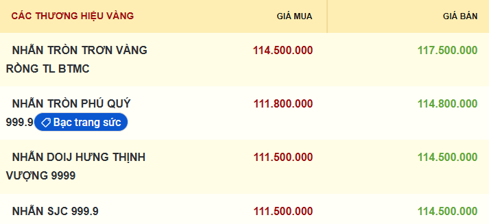 Tương tự vàng miếng, vàng nhẫn cũng được các thương hiệu SJC, DOJI, Phú Quý và Bảo Tín Minh Châu điều chỉnh tăng 500.000 đồng/lượng ở cả hai chiều mua - bán so với phiên trước. Hiện giá vàng nhẫn thấp hơn vàng miếng khoảng 1,8 - 4,8 triệu đồng/lượng.