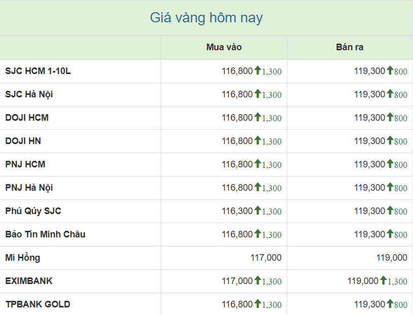 Công ty Vàng bạc đá quý Sài Gòn (SJC), Tập đoàn Vàng bạc Đá quý DOJI, PNJ, Phú Quý SJC và Bảo Tín Minh Châu đồng loạt niêm yết giá mua - bán vàng miếng ở mức 116,8 – 119,3 triệu đồng/lượng, tăng 1,3 triệu đồng/lượng chiều mua và 800.000 đồng/lượng chiều bán so với phiên trước. Riêng Mi Hồng vẫn niêm yết giá vàng ở mức 117 - 119 triệu đồng/lượng, không đổi so với phiên trước.