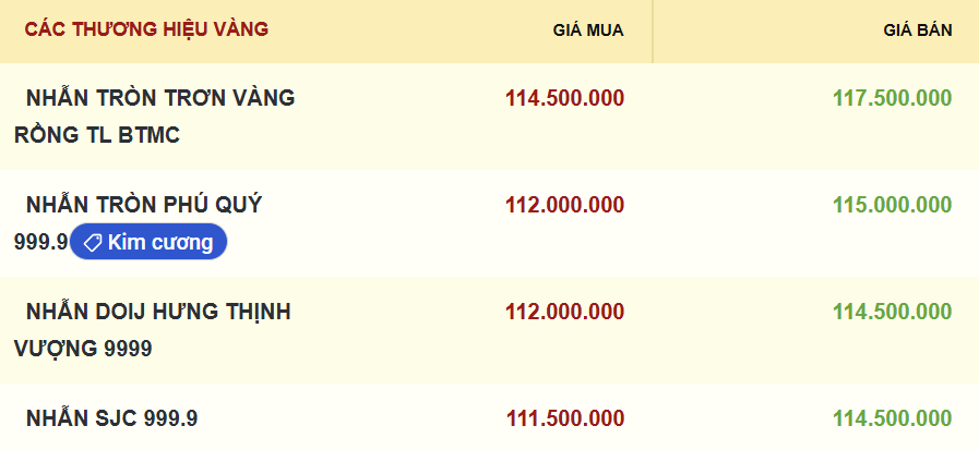 Trong khi đó, giá vàng nhẫn và vàng trang sức giữ nguyên ở chiều mua lẫn chiều bán, khi được giao dịch quanh 111,5 - 114,5 triệu đồng/lượng (chiều mua) và 114,5 - 117,5 triệu đồng/lượng (chiều bán).