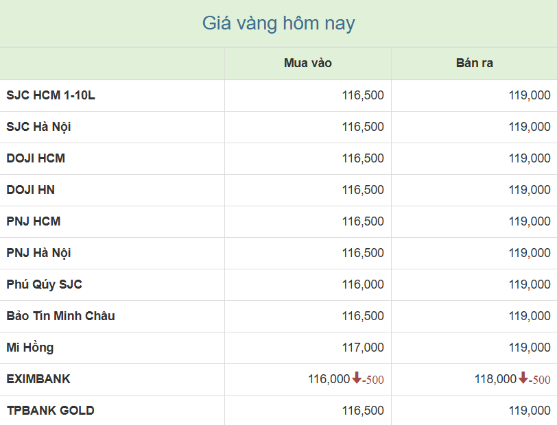 Công ty Vàng bạc đá quý Sài Gòn (SJC), Tập đoàn Vàng bạc Đá quý DOJI, PNJ, Phú Quý SJC và Bảo Tín Minh Châu đồng loạt niêm yết giá mua - bán vàng miếng SJC ở mức 116,5 – 119 triệu đồng/lượng, đi ngang cả hai chiều mua - bán so với phiên trước.