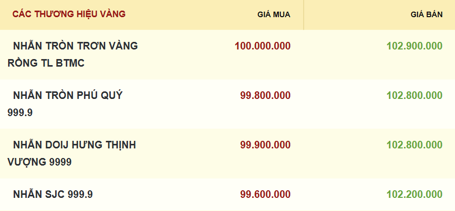 Tại Bảo Tín Minh Châu, giá vàng nhẫn tròn trơn vàng Rồng Thăng Long được điều chỉnh tăng 1,2 đồng/lượng chiều mua và 1 triệu đồng/lượng chiều bán so với chốt phiên ngày 2/4, giá bán ra hiện đứng ở mức 102,9 triệu đồng/lượng, giá mua vào ở mức 100 triệu đồng/lượng.