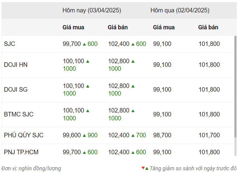 Cùng thời điểm, giá vàng miếng SJC sáng nay (ngày 3/4) được hầu hết các thương hiệu điều chỉnh theo xu hướng tăng 600.000 - 1 triệu đồng/lượng, với giá bán ra đứng ở mức 102,8 triệu đồng/lượng, giá mua vào ở mức 100,1 triệu đồng/lượng.