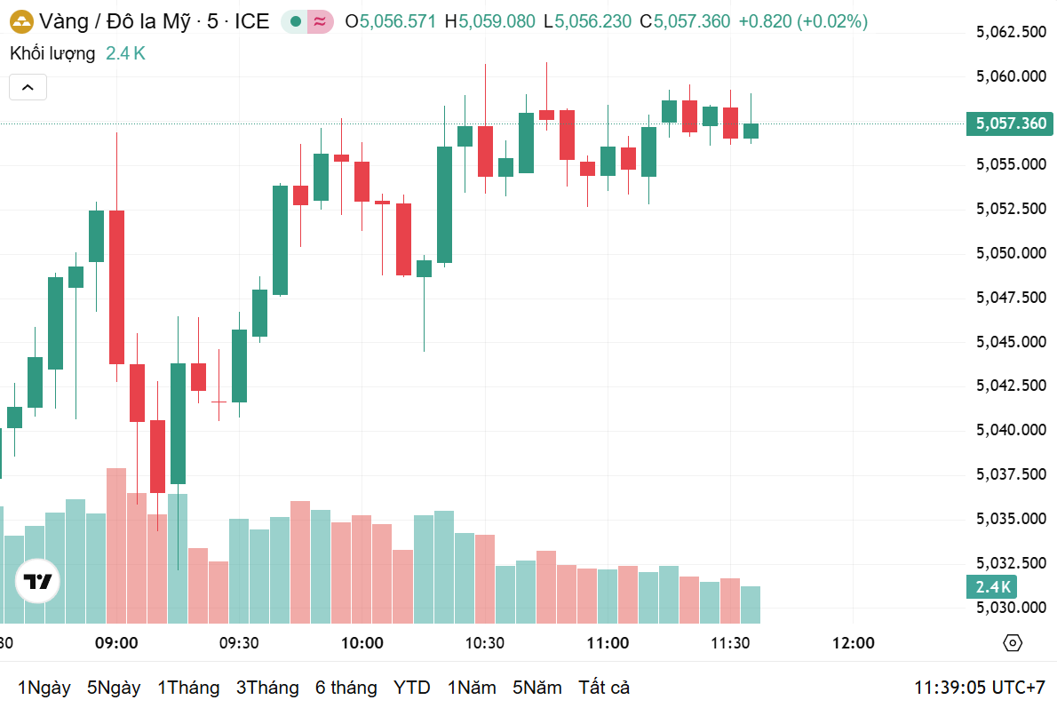 Thời điểm 10h30 theo giờ Việt Nam, giá vàng thế giới giao ngay ở mức 5.057 USD/ounce, tăng 0,05% trong 24 giờ qua, tương ứng với tăng 2,43 USD/Ounce. Hiện, giá vàng thế giới quy đổi sang tiền Việt Nam đồng khoảng 159 triệu đồng/lượng.