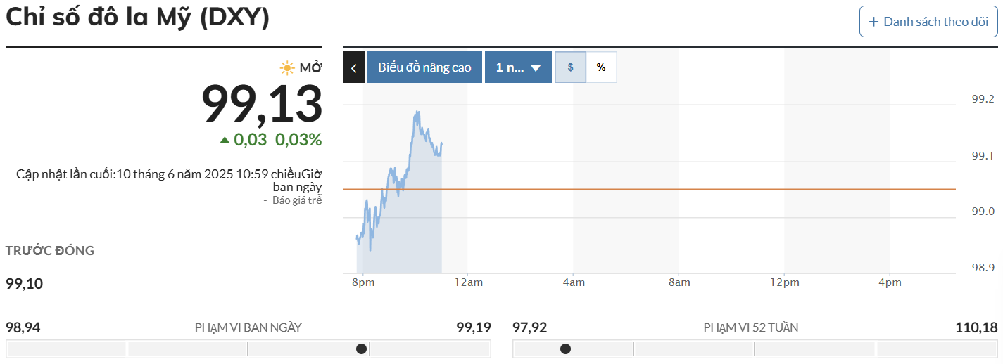 Cùng thời điểm, trên thị trường thế giới, chỉ số USD Index (DXY) - thước đo sức mạnh của đồng USD - đứng ở mức 99,13 điểm, tăng 0,03% so với phiên trước.