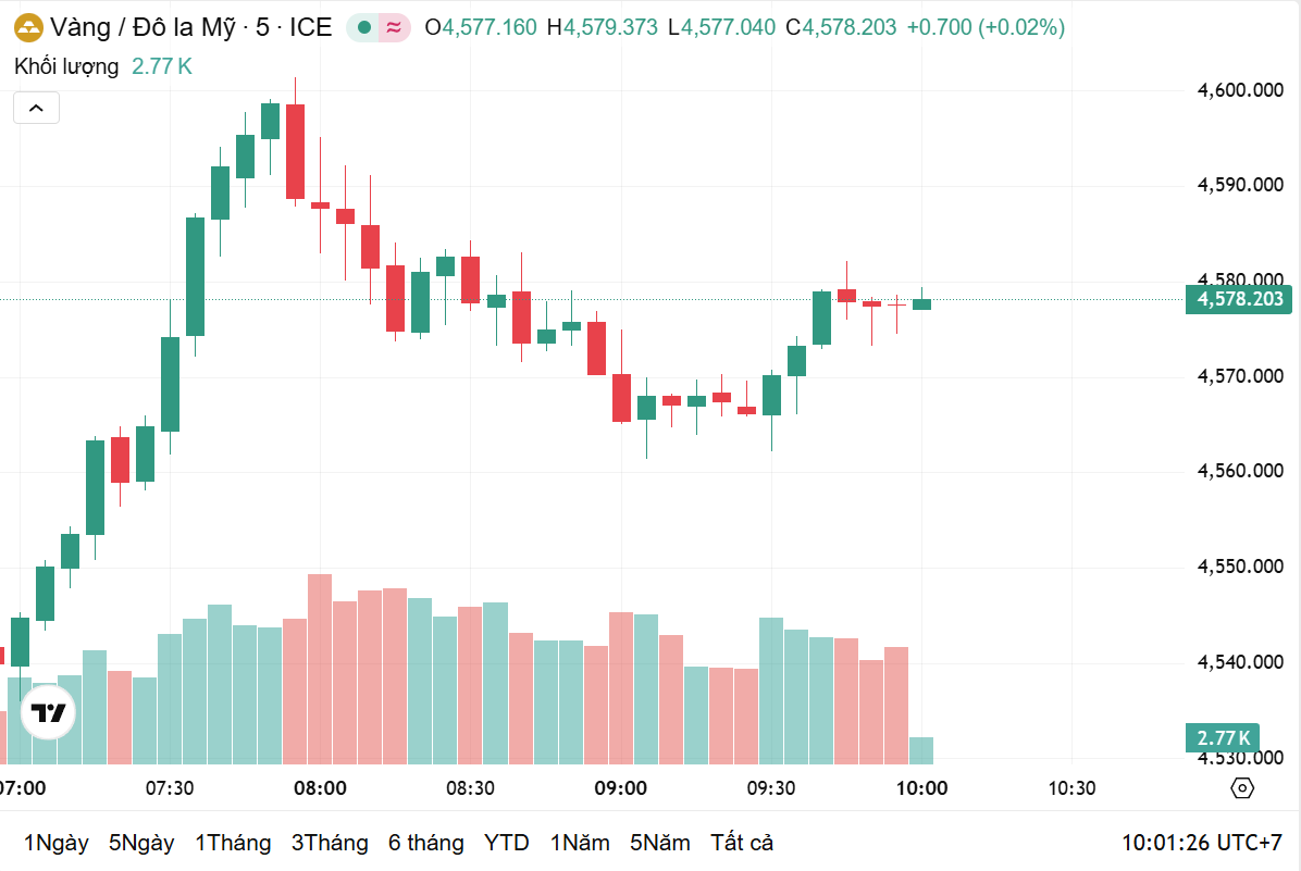 Giá vàng trong nước tiếp tục đi theo xu hướng chung thế giới. Thời điểm 9h30' theo giờ Việt Nam, giá vàng thế giới giao ngay ở mức 4.578 USD/ounce, tăng 85,50 USD/ounce so với với đầu phiên sáng. Hiện, giá vàng thế giới quy đổi theo tỷ giá niêm yết tại Vietcombank vào khoảng 145,6 triệu đồng/lượng.