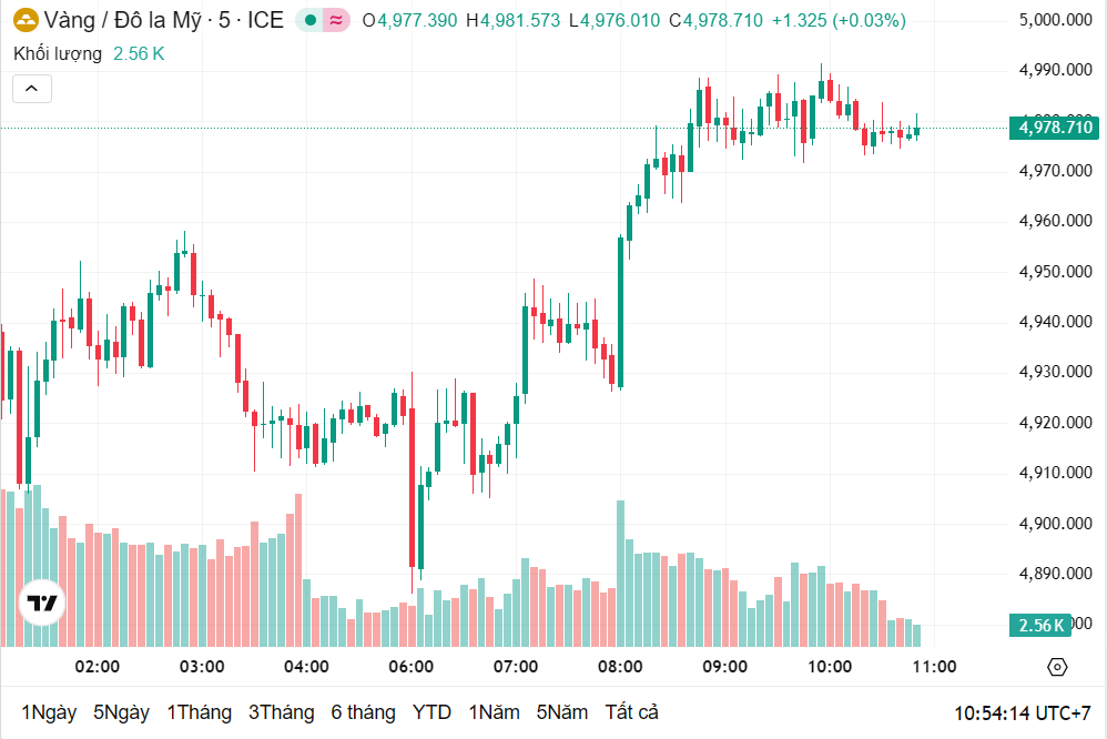 Giá vàng trong nước giảm về mức thấp nhất trong khoảng 1 tuần qua, do ảnh hưởng từ giá vàng thế giới. Thời điểm 10h45 theo giờ Việt Nam, giá vàng thế giới giao ngay ở mức 4.978 USD/ounce, giảm 1,83% trong 24 giờ qua, tương ứng với giảm 92,66 USD/ounce. Hiện, giá vàng thế giới quy đổi sang tiền Việt Nam đồng khoảng 157,1 triệu đồng/lượng.