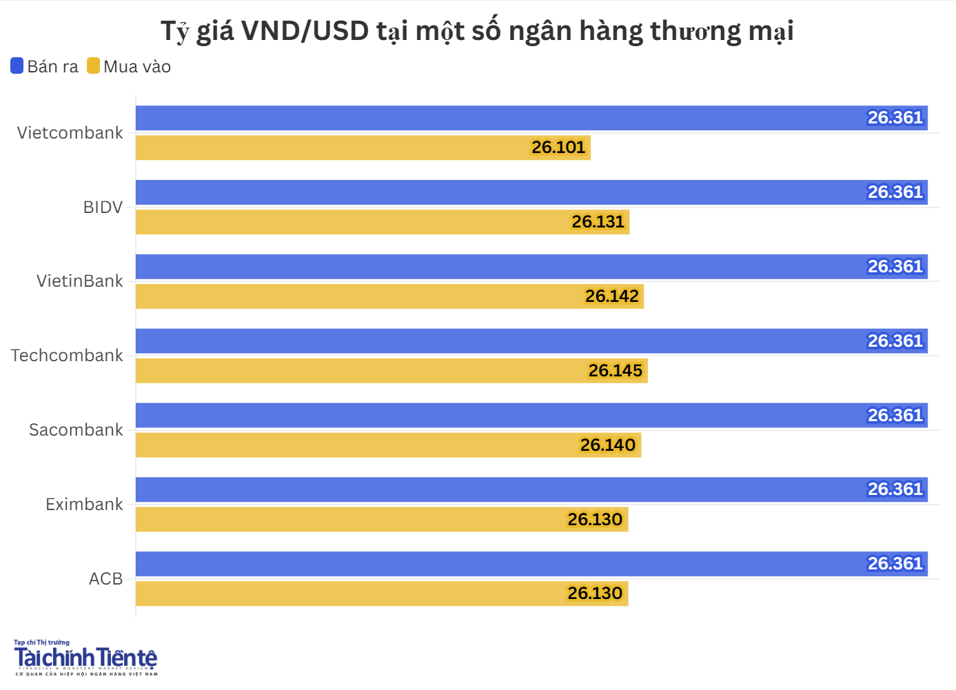 Hiện, giá mua thấp nhất ở mức 26.101 VND/USD, giá mua cao nhất ở mức 26.145 VND/USD. Giá bán được các ngân hàng niêm yết đồng loạt ở mức 26.361 VND/USD.