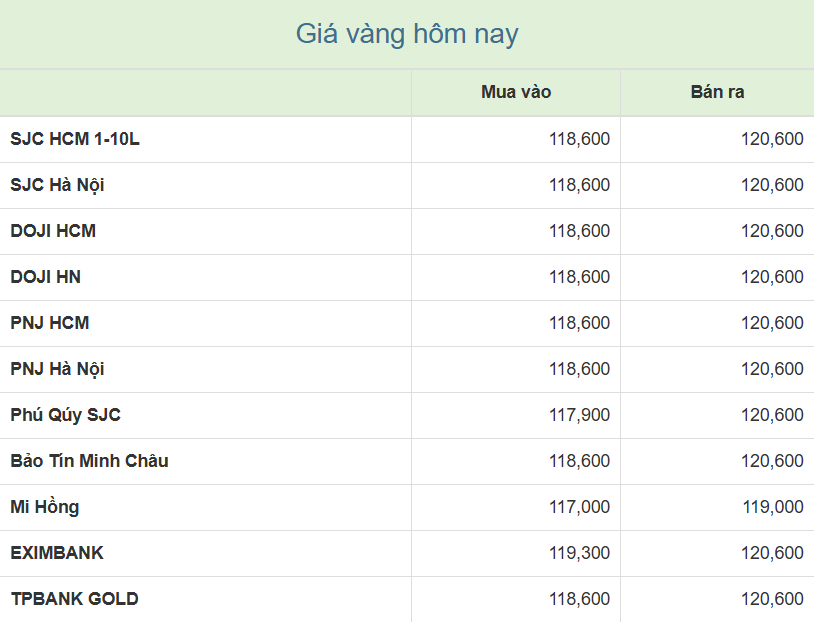 Công ty Vàng bạc đá quý Sài Gòn (SJC), Tập đoàn Vàng bạc Đá quý DOJI, PNJ và Bảo Tín Minh Châu cùng niêm yết giá vàng miếng mua vào-bán ra ở mức 118,6-120,6 triệu đồng/lượng, đi ngang ở cả chiều mua vào và chiều bán ra so chốt phiên trước.