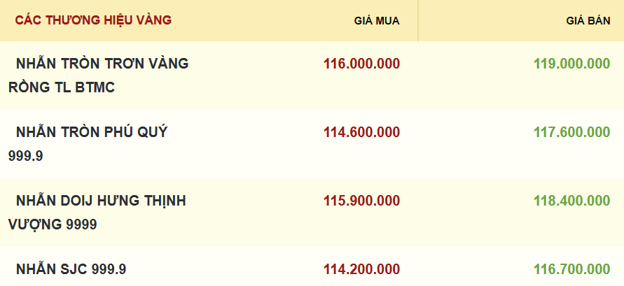 Cùng diễn biến, giá vàng nhẫn và vàng trang sức 99,99 được các thương hiệu điều chỉnh theo xu hướng đi ngang ở cả 2 chiều mua và bán so với phiên trước. Hiện giá vàng nhẫn đang thấp hơn vàng miếng SJC khoảng 2,3 - 3,9 triệu đồng/lượng.