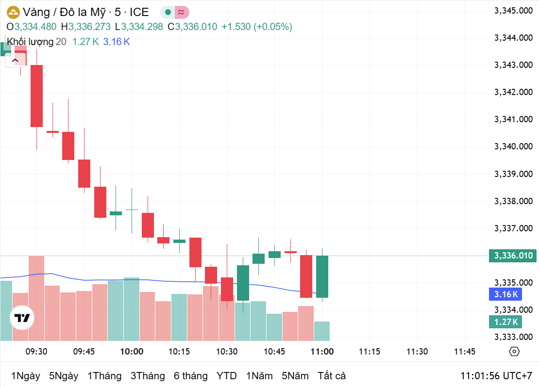 Thời điểm 11h05' hôm nay (ngày 18/7, giờ Việt Nam), theo Kitco.com, giá vàng thế giới giảm 5 USD, hiện đứng ở mức 3.336 USD/ounce. Quy đổi theo tỷ giá Vietcombank, mức giá này tương đương khoảng 105,9 triệu đồng/lượng.
