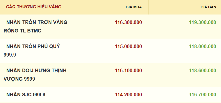 Cùng diễn biến, giá vàng nhẫn và vàng trang sức 99,99 được các thương hiệu điều chỉnh theo xu hướng tăng 200.000 đồng/lượng ở cả 2 chiều mua và bán so với phiên trước. Hiện giá vàng nhẫn đang thấp hơn vàng miếng SJC khoảng 1,9 - 4,5 triệu đồng/lượng.