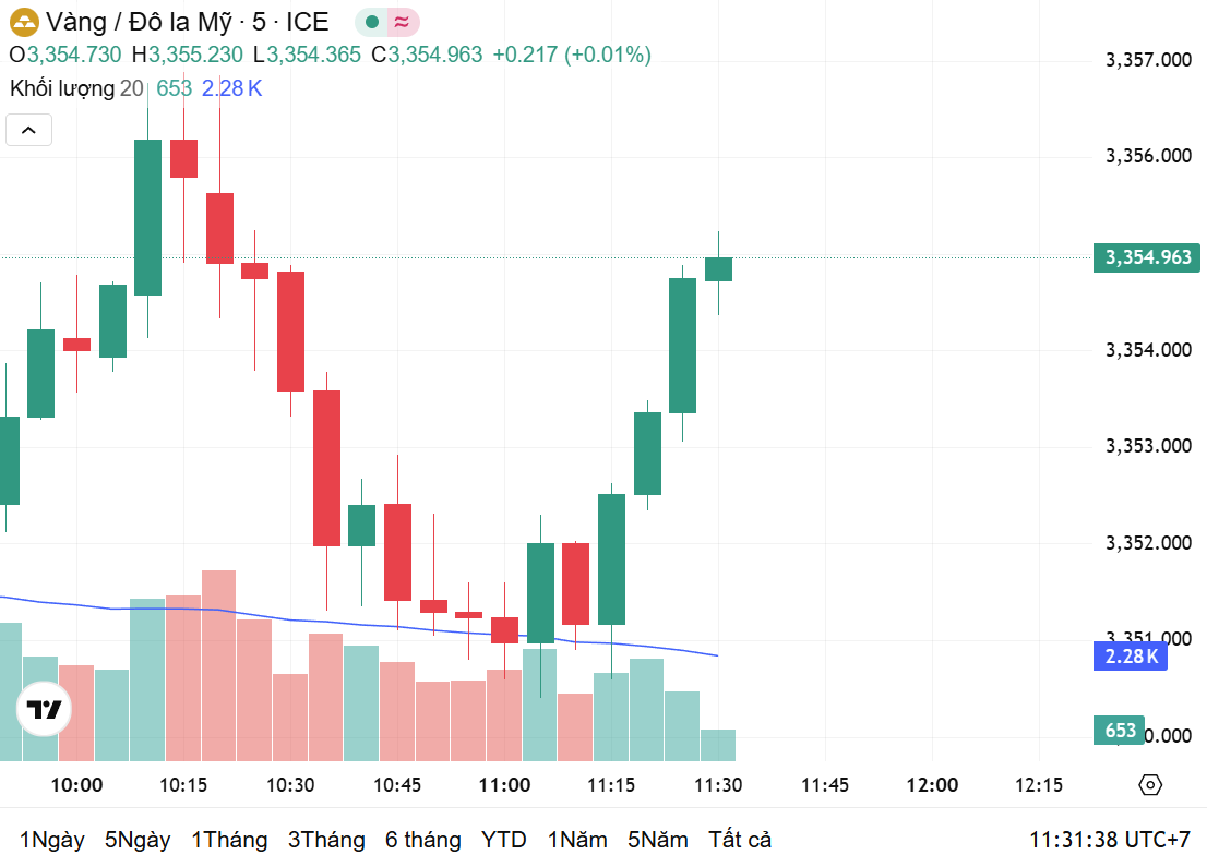 Thời điểm 11h05' hôm nay (ngày 21/7, giờ Việt Nam), theo Kitco.com, giá vàng thế giới tăng 3,18 USD, hiện đứng ở mức 3.355 USD/ounce. Quy đổi theo tỷ giá Vietcombank, mức giá này tương đương khoảng 106,5 triệu đồng/lượng.