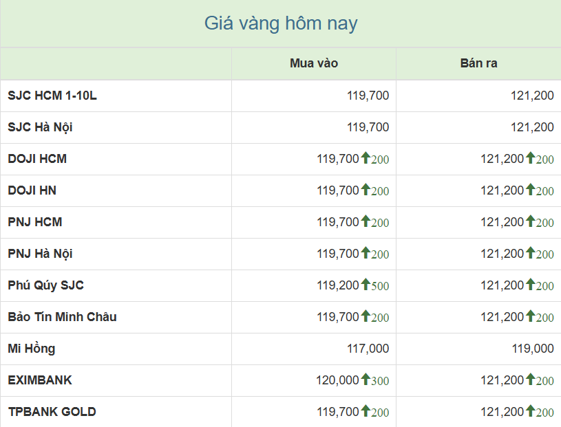Tập đoàn Vàng bạc Đá quý DOJI, PNJ và Bảo Tín Minh Châu cùng niêm yết giá vàng miếng mua vào-bán ra ở mức 119,7-121,2 triệu đồng/lượng, tăng 200.000 đồng/lượng ở cả chiều mua vào và chiều bán ra so phiên trước.