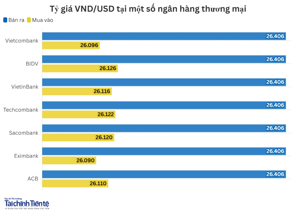 Hiện, giá mua thấp nhất ở mức 26.090 VND/USD, giá mua cao nhất ở mức 26.126 VND/USD. Giá bán ra được các ngân hàng đồng loạt niêm yết ở mức 26.406 VND/USD.