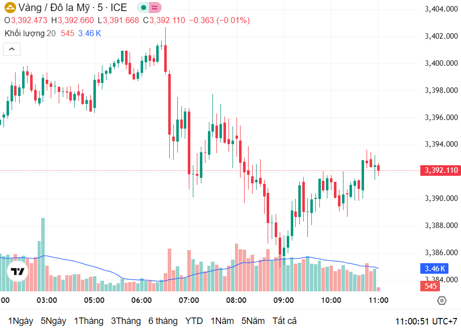 Thời điểm 11h05' hôm nay (ngày 22/7, giờ Việt Nam), theo Kitco.com, giá vàng thế giới tăng mạnh 41,37 USD, hiện đứng ở mức 3.393 USD/ounce. Quy đổi theo tỷ giá Vietcombank, mức giá này tương đương khoảng 105,9 triệu đồng/lượng.