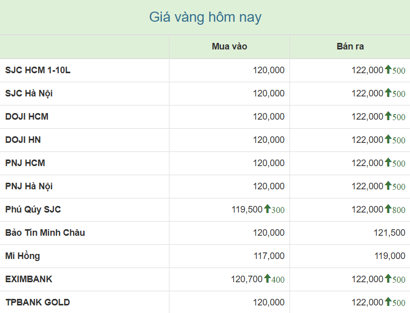 Công ty Vàng bạc đá quý Sài Gòn (SJC), Tập đoàn Vàng bạc Đá quý DOJI, PNJ và Bảo Tín Minh Châu cùng niêm yết giá vàng miếng mua vào-bán ra ở mức 120-122 triệu đồng/lượng, đi ngang chiều mua vào và tăng 500.000 đồng/lượng chiều bán ra so với phiên trước.
