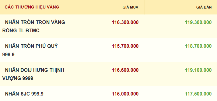 Còn giá vàng nhẫn và vàng trang sức 99,99 được các thương hiệu điều chỉnh theo xu hướng tăng 500.000 - 700.000 đồng/lượng ở cả 2 chiều mua và bán so với phiên trước, trừ Bảo Tín Minh Châu vẫn xu hướng đi ngang. Hiện giá vàng nhẫn đang thấp hơn vàng miếng SJC khoảng 2,7 - 4,5 triệu đồng/lượng.