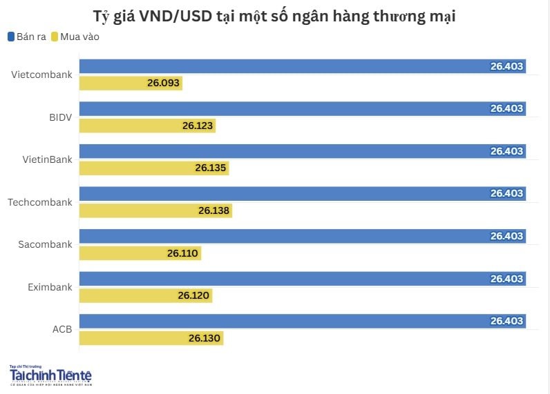 Hiện, giá mua thấp nhất ở mức 26.093 VND/USD, giá mua cao nhất ở mức 26.138 VND/USD. Giá bán ra được các ngân hàng đồng loạt niêm yết ở mức 26.403 VND/USD.