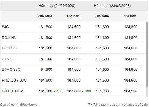 Công ty Vàng bạc đá quý Sài Gòn (SJC), Tập đoàn Vàng bạc Đá quý DOJI, Bảo Tín Minh Châu, Bảo Tín Mạnh Hải và Phú Quý SJC cùng niêm yết giá vàng miếng SJC mua vào-bán ra ở mức 181,6-184,6 triệu đồng/lượng, đi ngang ở cả chiều mua và chiều bán ra so với phiên sáng ngày 23/2.