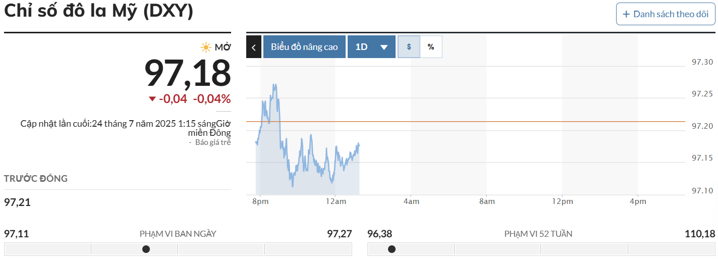 Chỉ số DXY chạm mức thấp nhất trong 3 tuần, khi tiến triển trong các cuộc đàm phán thương mại với các đối tác lớn đã hỗ trợ cho các đồng tiền đối thủ. Các báo cáo cho thấy, Mỹ và Liên minh châu Âu (EU) đang tiến gần hơn đến một thỏa thuận, với trọng tâm là mức thuế cơ bản 15% đối với hàng hóa EU và khả năng miễn trừ một số mặt hàng. Trước đó, Nhật Bản đã đồng ý với mức thuế tương tự 15% đối với hàng xuất khẩu sang Mỹ, giảm từ mức 25% mà Tổng thống Donald Trump từng đe dọa áp dụng.