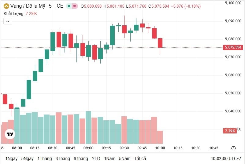 Thời điểm 10h00 theo giờ Việt Nam, giá vàng thế giới giao ngay ở mức 5.078 USD/ounce, bật tăng 2% trong 24 giờ qua, tương ứng với tăng 99,51 USD/ounce. Hiện, giá vàng thế giới quy đổi sang tiền Việt Nam đồng có giá là 161,4 triệu đồng/lượng.