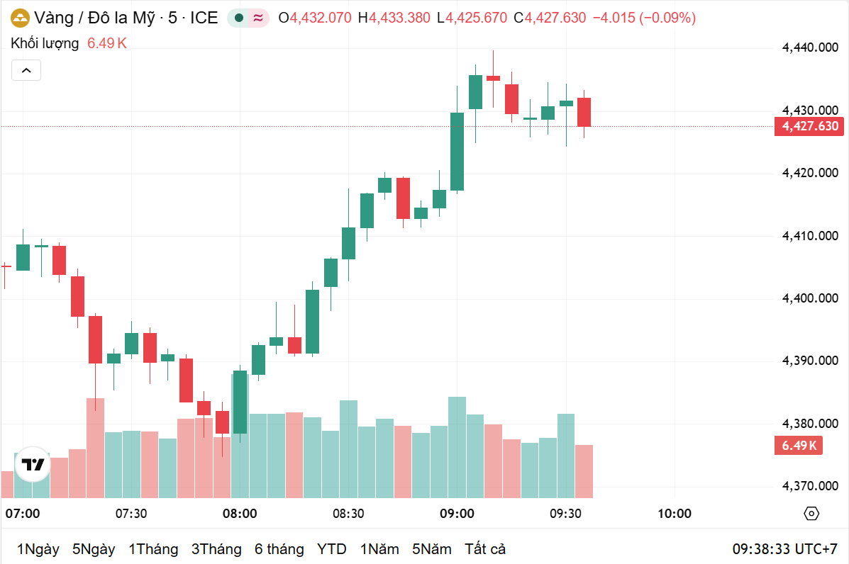 Thời điểm 9h00 theo giờ Việt Nam, giá vàng thế giới giao ngay ở mức 4.427 USD/ounce, tăng 2,73% trong 24 giờ qua, tương ứng với mức tăng 124 USD/ounce. Hiện, giá vàng thế giới quy đổi sang Việt Nam đồng khoảng 140,7 triệu đồng/lượng.